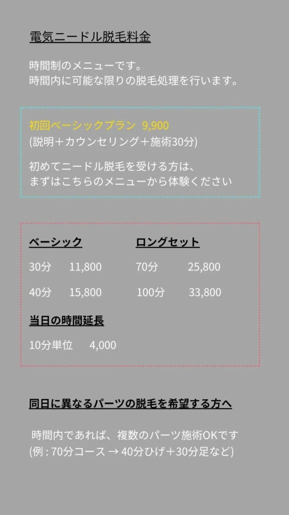 また、電気ニードル脱毛は肌の水分量によって効果に影響を受けます。施術前日は、水をしっかり飲むことをおすすめします。